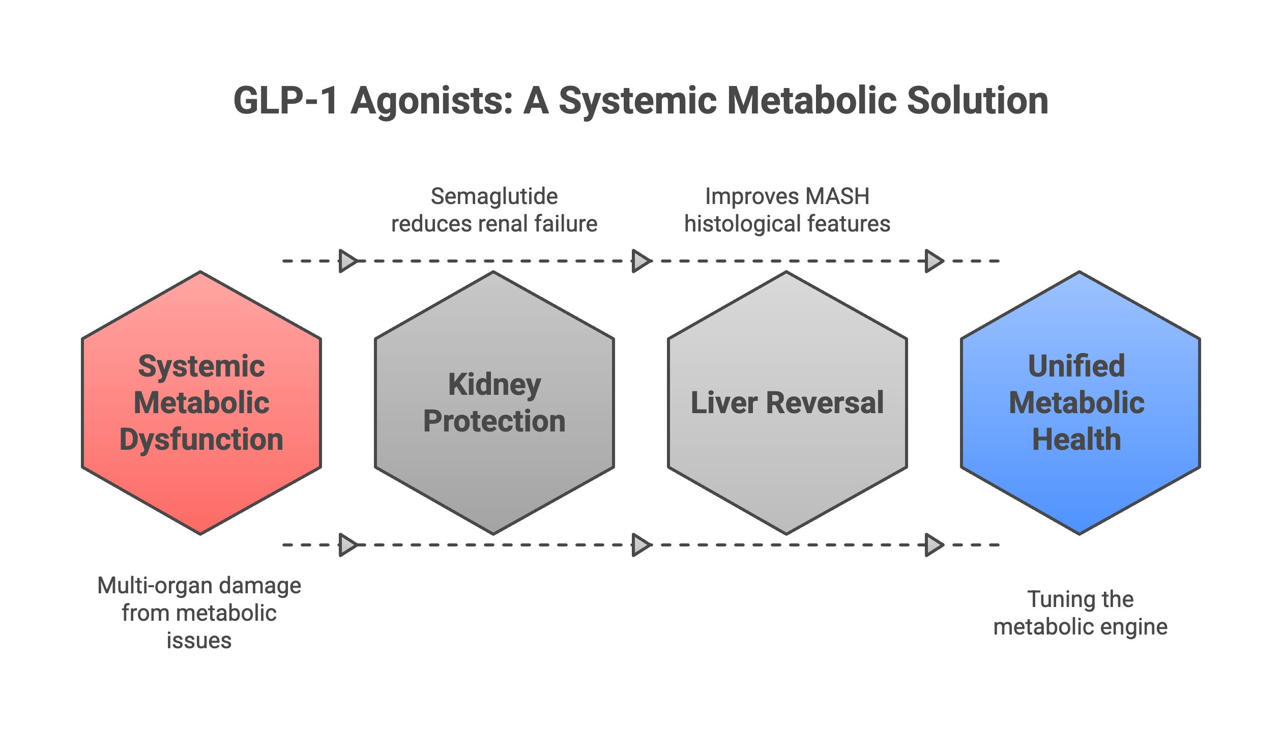We are witnessing a pharmacological unification theory. Heart failure, kidney disease, fatty liver, and atherosclerosis are not separate diseases requiring separate specialists. They are different faces of the same metabolic engine. GLP-1 receptor agonists tune that engine.