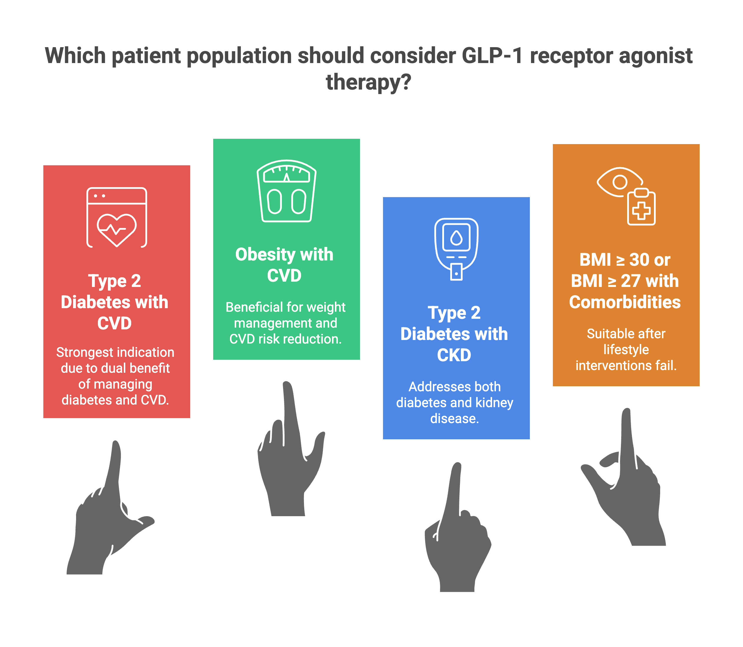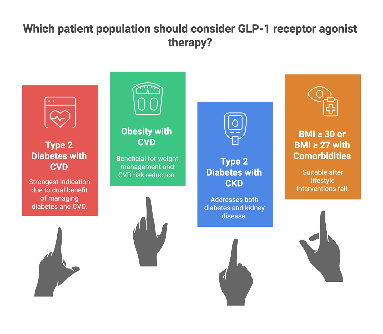 Current guidelines provide clear direction. The 2025 ADA Standards of Care and 2023 ESC guidelines give strong recommendations for GLP-1 receptor agonists in patients with type 2 diabetes and established atherosclerotic cardiovascular disease. For cardiologists and clinicians, several patient populations warrant consideration: