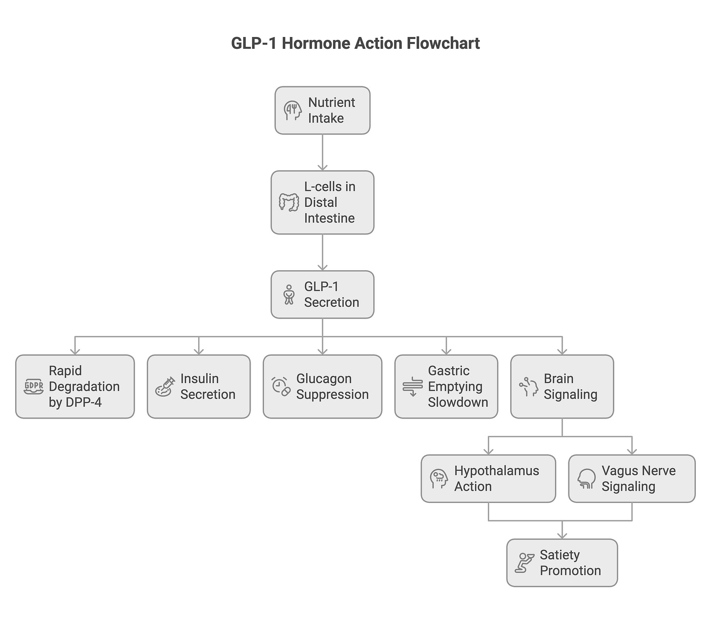 It nudges insulin secretion upward in a glucose-dependent manner, suppresses glucagon to stop the liver from overproducing sugar, and slows gastric emptying (3). Crucially, it also talks to the brain. Through direct action on the hypothalamus and indirect signaling via the vagus nerve, GLP-1 promotes satiety(4).