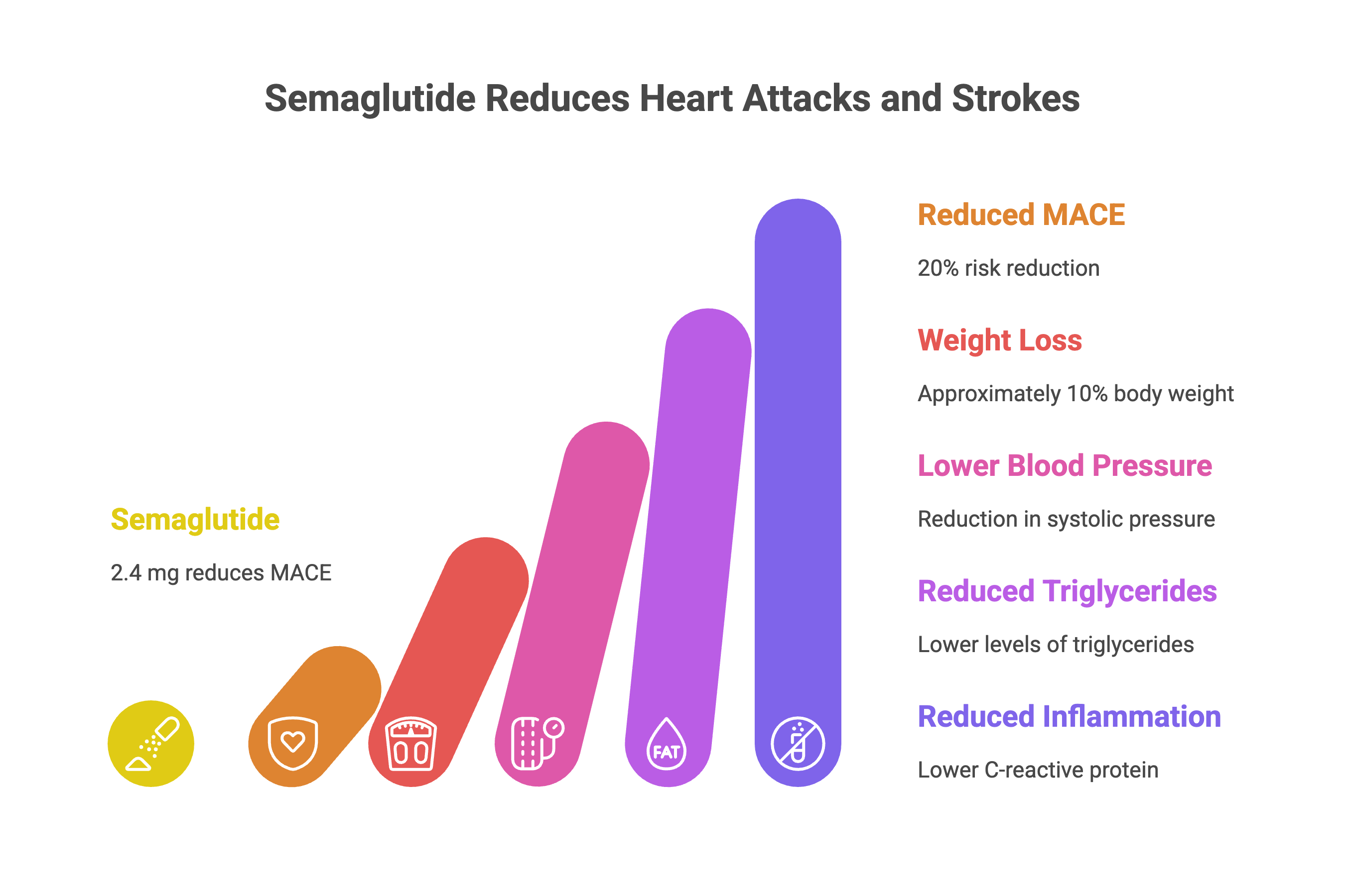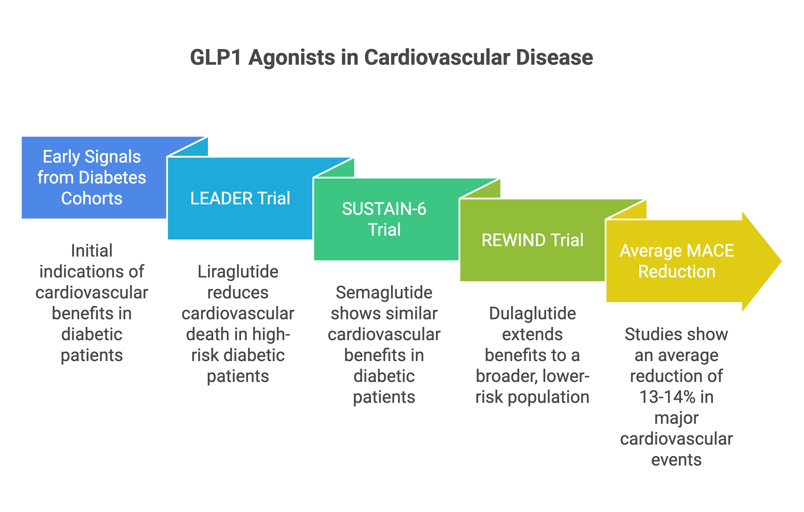 The narrative shift from “diabetes drug” to “cardiovascular drug” was built on a foundation of rigorous, large-scale randomized controlled trials. The early signals came from diabetes cohorts. The LEADER trial demonstrated that liraglutide reduced cardiovascular death in high-risk diabetic patients (6). SUSTAIN-6 showed similar benefits with semaglutide (7), and REWIND extended these findings to a broader, lower-risk population with dulaglutide (8). Across these studies, the reduction in major adverse cardiovascular events (MACE: a composite of heart attack, stroke, and cardiovascular death) averaged around 13 to 14%.
