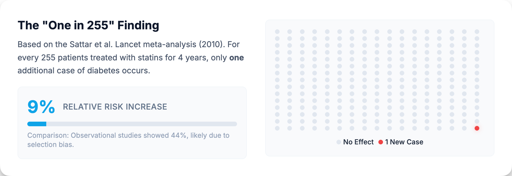However, this observational estimate should be interpreted cautiously. The dramatic discrepancy between the 9% RCT estimate and the 44% observational figure likely reflects confounding by indication—the very factors that lead physicians to prescribe statins (obesity, metabolic syndrome, elevated cardiovascular risk) also independently predispose patients to diabetes. Observational studies also suffer from surveillance bias: patients on statins receive more frequent blood tests, so diabetes gets detected earlier. The RCT estimate of 9% is almost certainly closer to the true causal effect, while the larger observational signal reflects the reality that statin-treated populations already carry elevated metabolic risk.