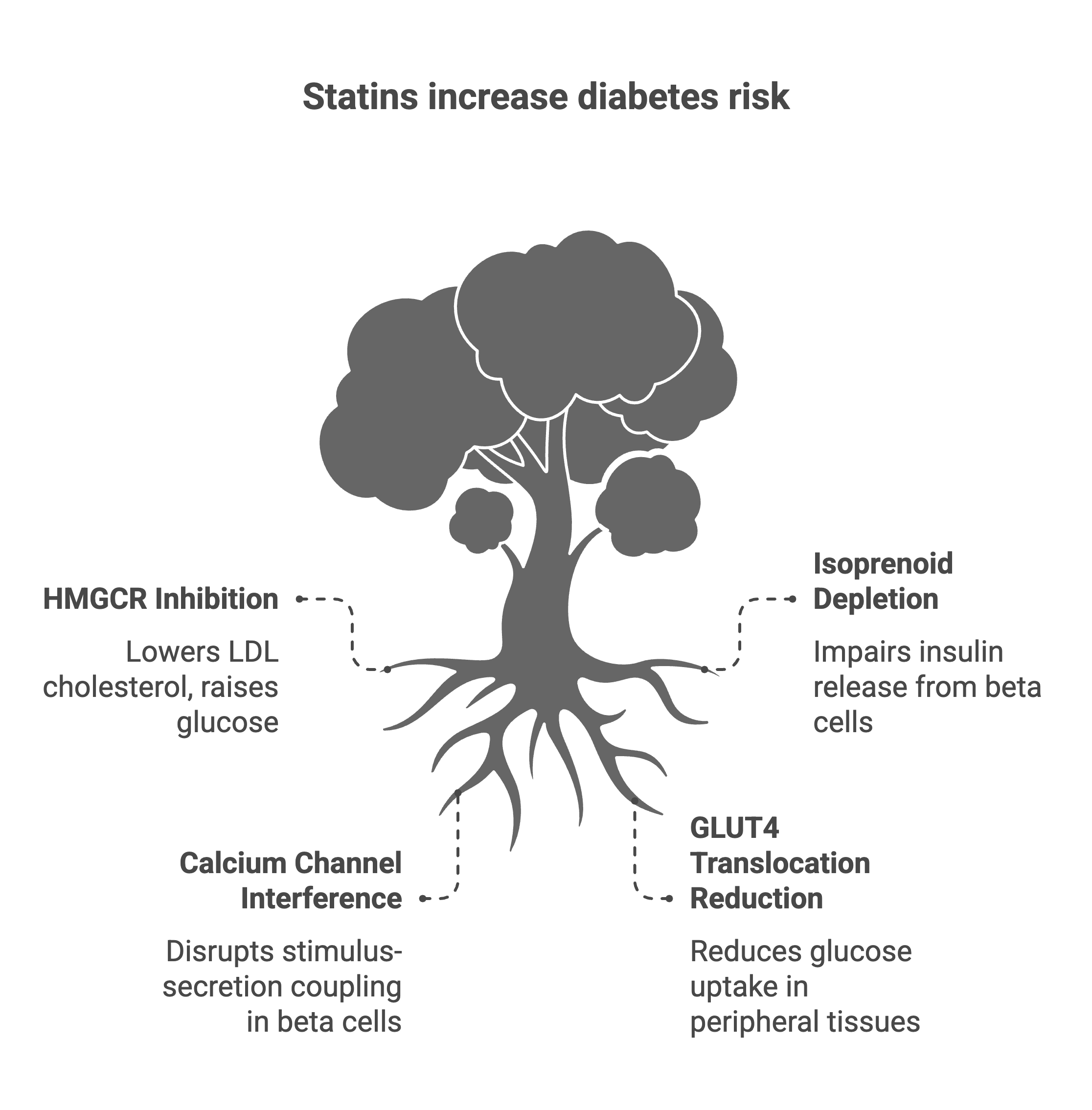 The biological pathways are becoming clearer nonetheless. Statins appear to impair glucose homeostasis through at least two distinct routes, both stemming from inhibition of the mevalonate pathway—the same pathway that produces cholesterol.