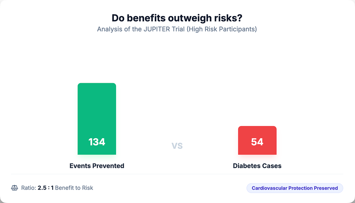 The JUPITER trial provides perhaps the most granular answer. Among participants with diabetes risk factors who took rosuvastatin, 134 vascular events or deaths were prevented for every 54 new diabetes cases diagnosed. That’s roughly a 2.5:1 benefit-to-risk ratio. Among those without diabetes risk factors, 86 vascular events were prevented with no new diabetes cases—essentially all benefit, no metabolic cost.