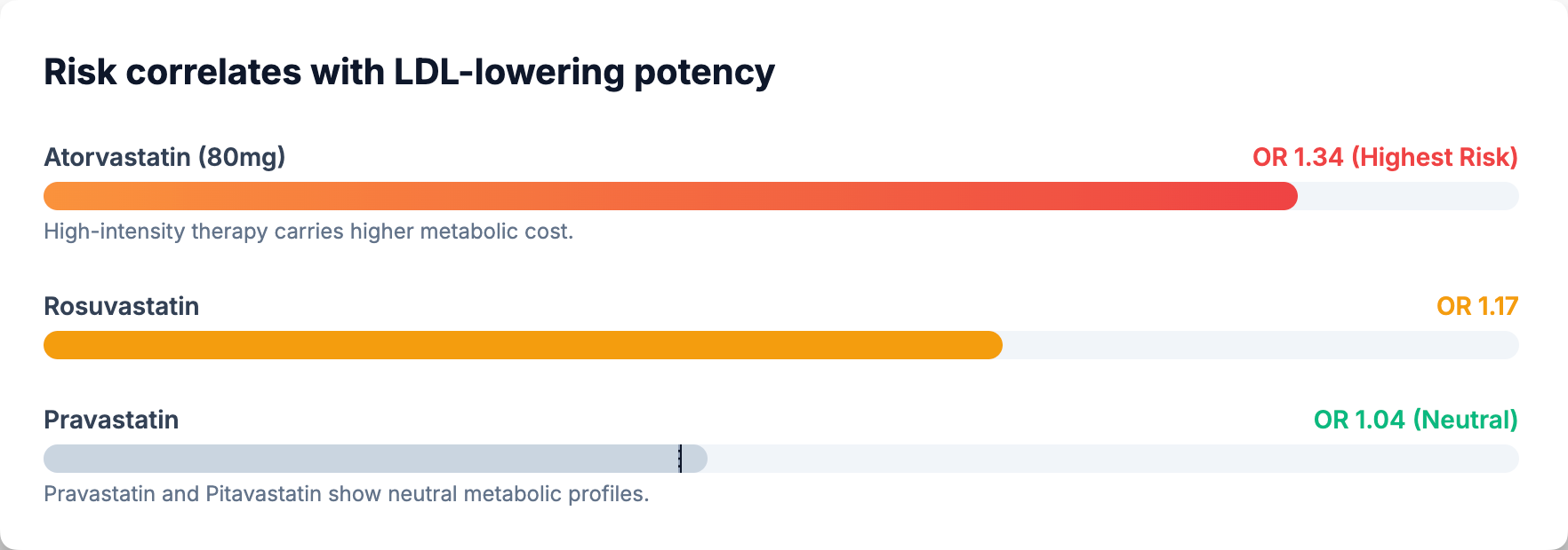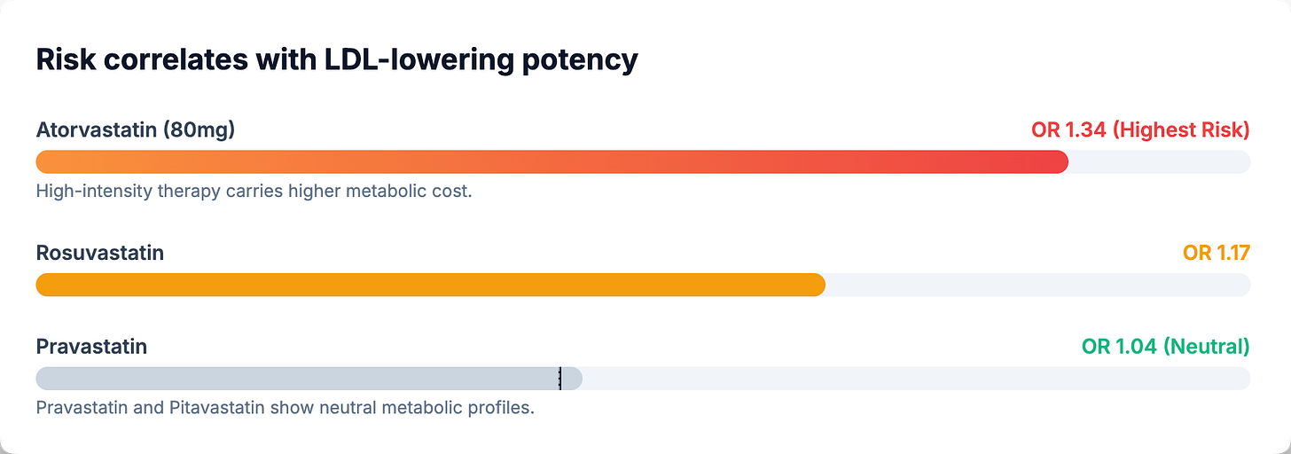 What’s more, the effect appears dose-dependent. A network meta-analysis of 29 trials examining individual statins found that high-dose atorvastatin (80 mg) carried the highest diabetes risk (OR 1.34; 95% CI 1.14–1.57), followed by rosuvastatin (OR 1.17; 95% CI 1.02–1.35) (3). Pravastatin appeared genuinely neutral (OR 1.04; 95% CI 0.93–1.16). Data on pitavastatin suggest possible neutrality, though estimates remain imprecise due to limited trial data (OR 0.74; 95% CI 0.31–1.77—a confidence interval spanning nearly six-fold). The overall pattern is consistent with what we’d expect from a mechanism tied to LDL-lowering potency—the more aggressively you lower LDL, the greater the metabolic perturbation.