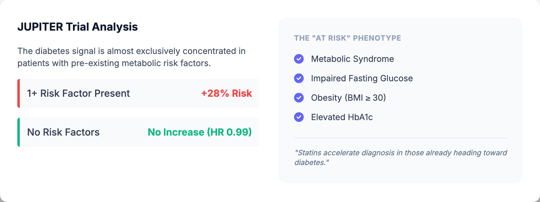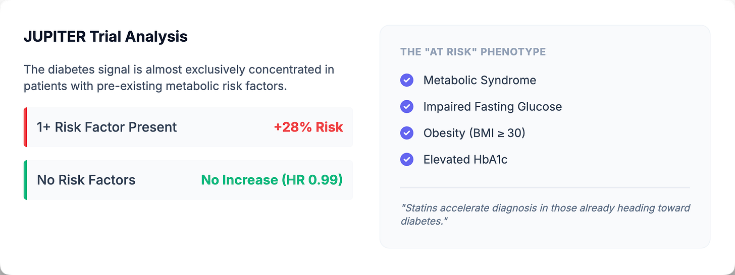 Not everyone faces equal risk. The diabetes signal concentrates among individuals who were already on the path toward metabolic dysfunction. In the JUPITER trial—a large primary prevention study of rosuvastatin—researchers stratified participants by pre-existing diabetes risk factors: metabolic syndrome, impaired fasting glucose, obesity (BMI ≥30), or elevated hemoglobin A1c (8).
